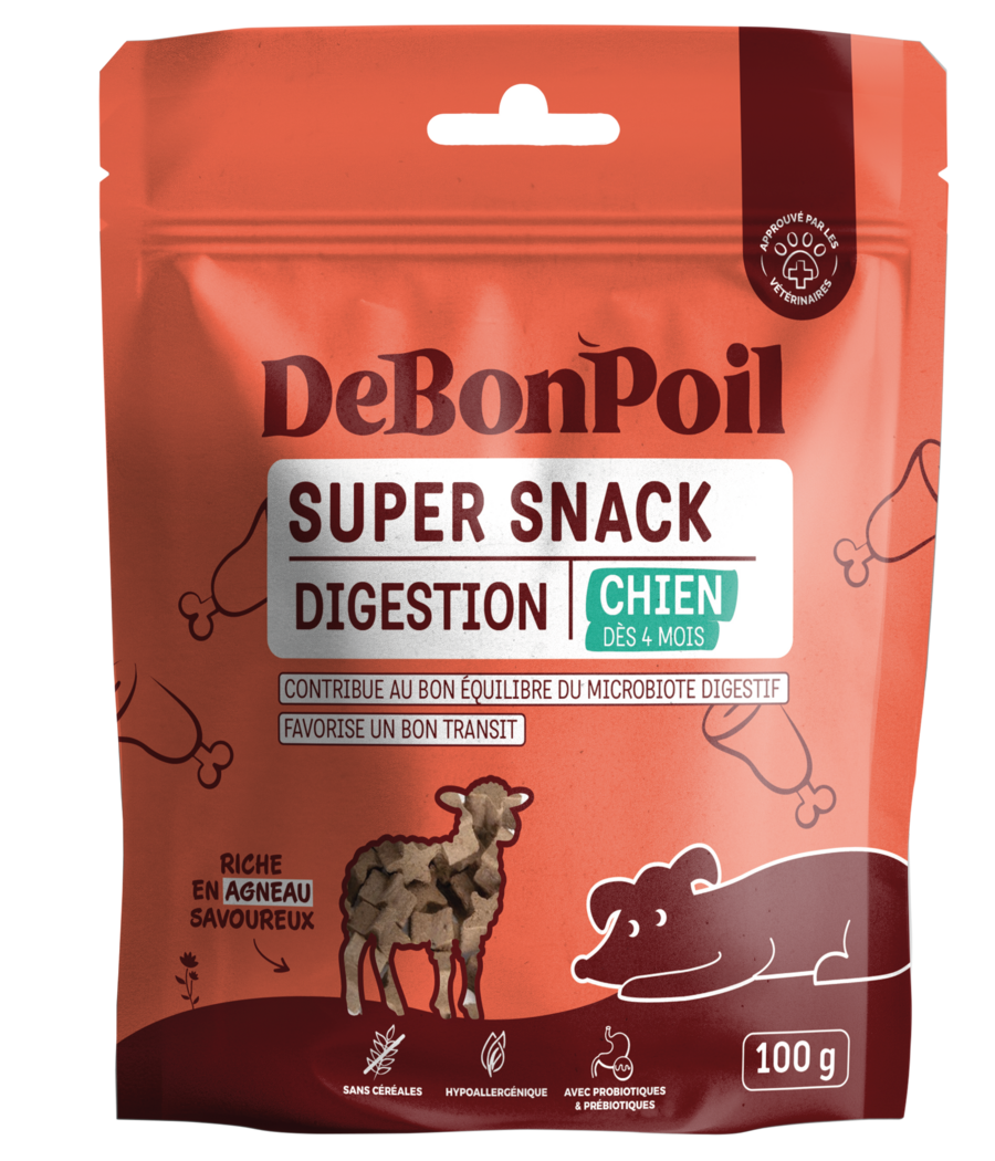 Le Super Snack Digestion DeBonPoil est une friandise savoureuse à l'agneau conçue pour les chiens dès l'âge de 4 mois. Riche en agneau savoureux, cette recette hypoallergénique et sans céréales contient des prébiotiques et probiotiques pour favoriser un bon transit et l'équilibre du microbiote.