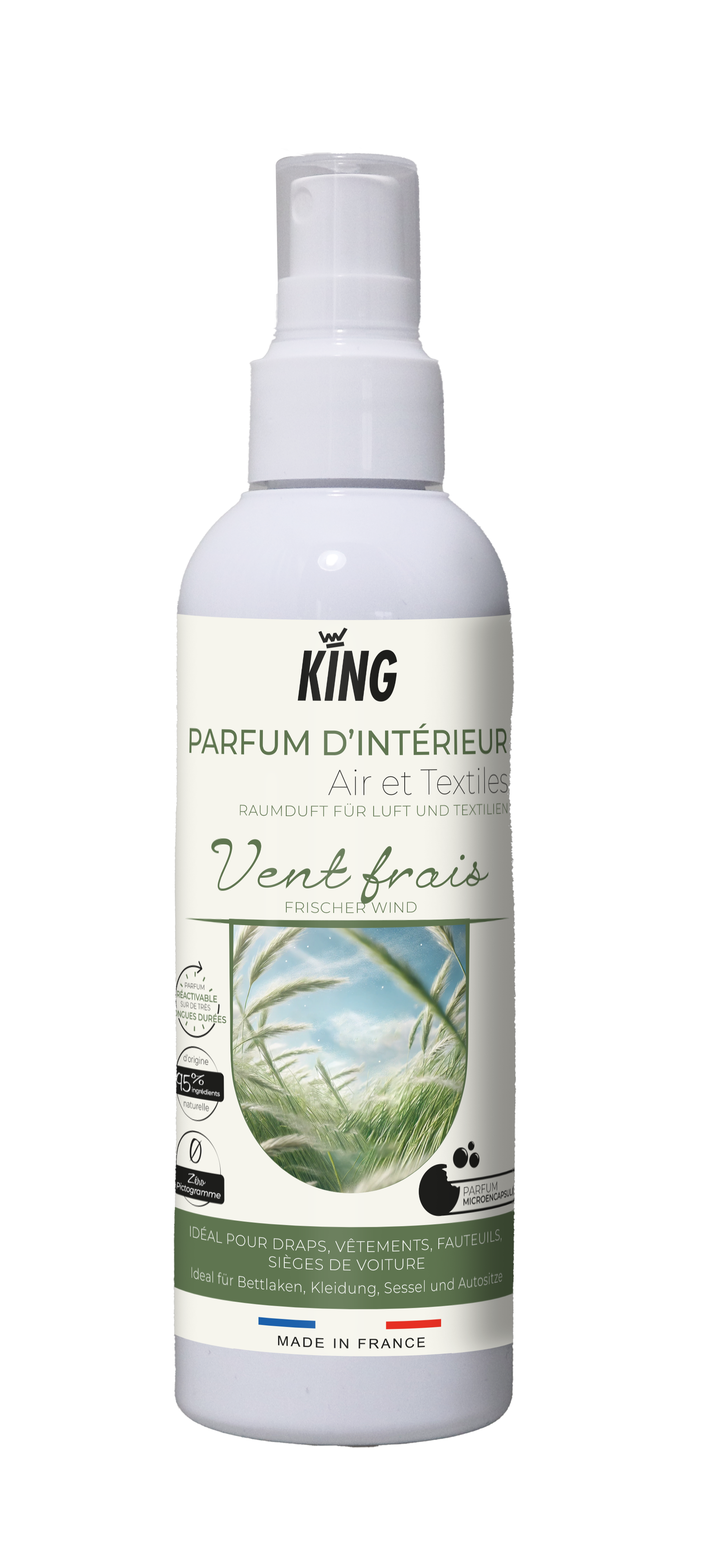 Le Parfum d'intérieur Air & Textiles Vent Frais KING est une solution double action qui parfume l'atmosphère et les supports textiles pour recréer une ambiance fraîche et propre. Grâce à la technologie innovante PlanetCaps™, ce parfum microencapsulé se fixe au cœur des fibres et se réactive par simple contact. Composé à 95 % d'ingrédients d'origine naturelle, il est sans danger pour l'homme et son environnement.