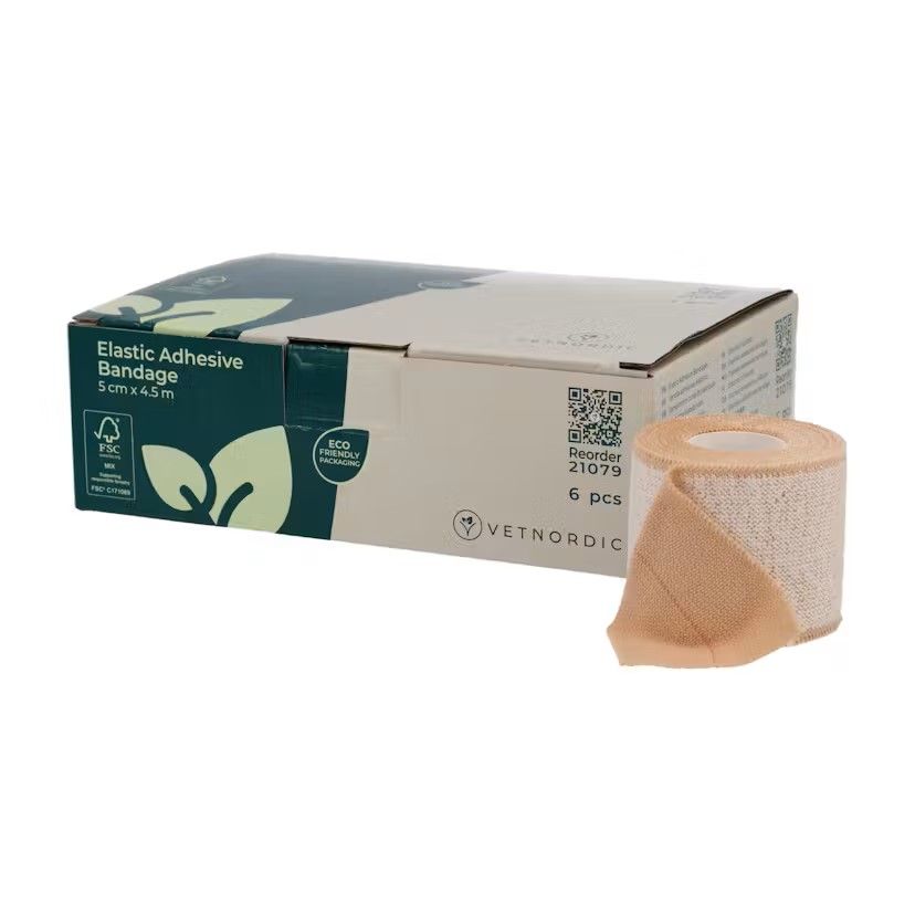 La bande adhésive élastique VetNordic (5 cm x 4,5 m) est une bande de contention forte en tissu tissé. Contrairement aux bandes cohésives, elle possède une face adhésive puissante qui garantit une fixation inébranlable, idéale pour les contentions articulaires, les strappings ou le maintien de pansements en conditions difficiles.