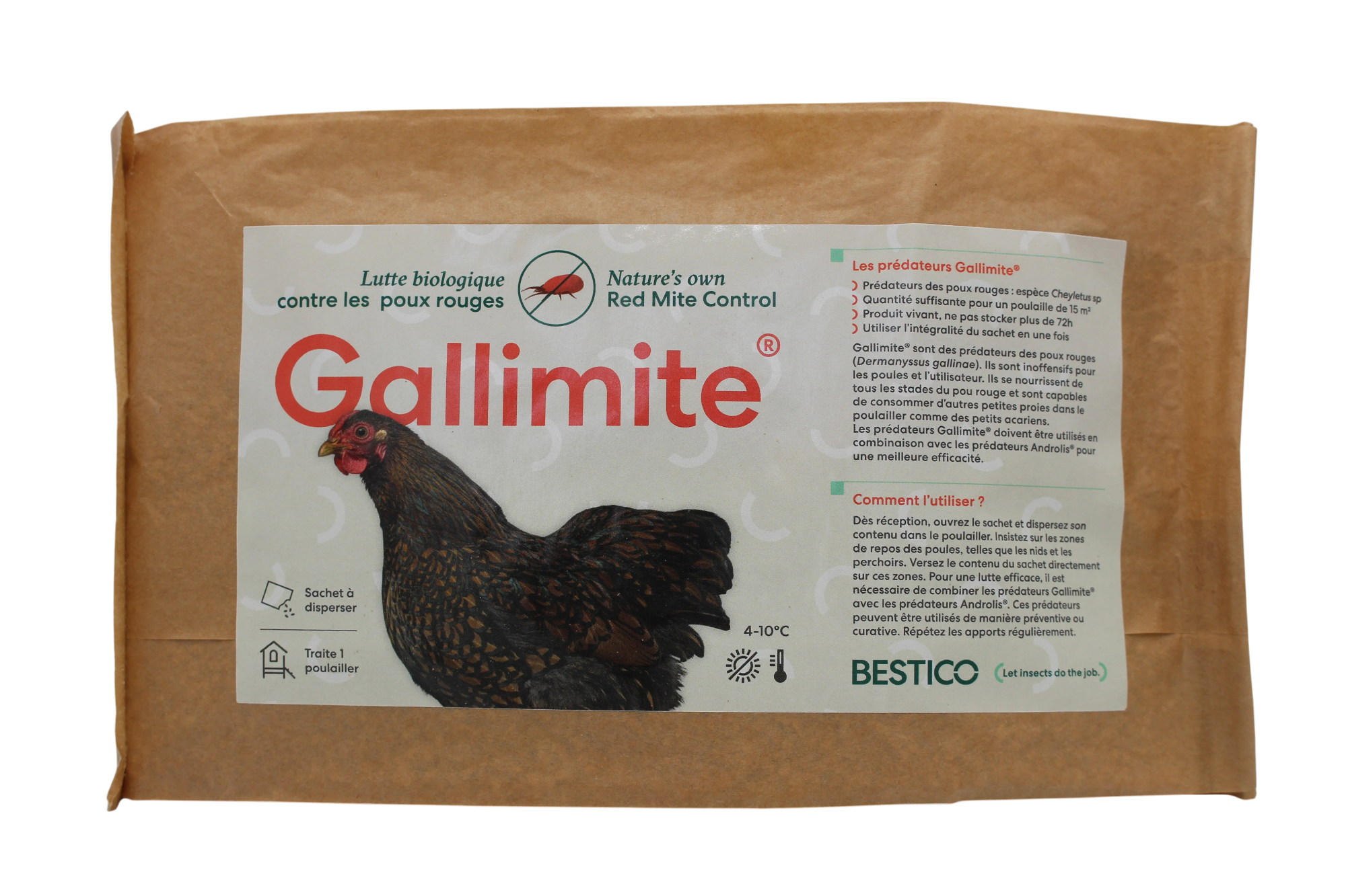 Gallimite est une solution 100% naturelle pour protéger vos poules des invasions de poux rouges. Ce sachet contient un substrat riche en acariens prédateurs (Androlaelaps casalis). Une fois dispersés dans le poulailler, ces "bons" acariens traquent et dévorent les poux rouges nuisibles jusque dans leurs cachettes. C'est l'alternative écologique idéale aux insecticides chimiques.